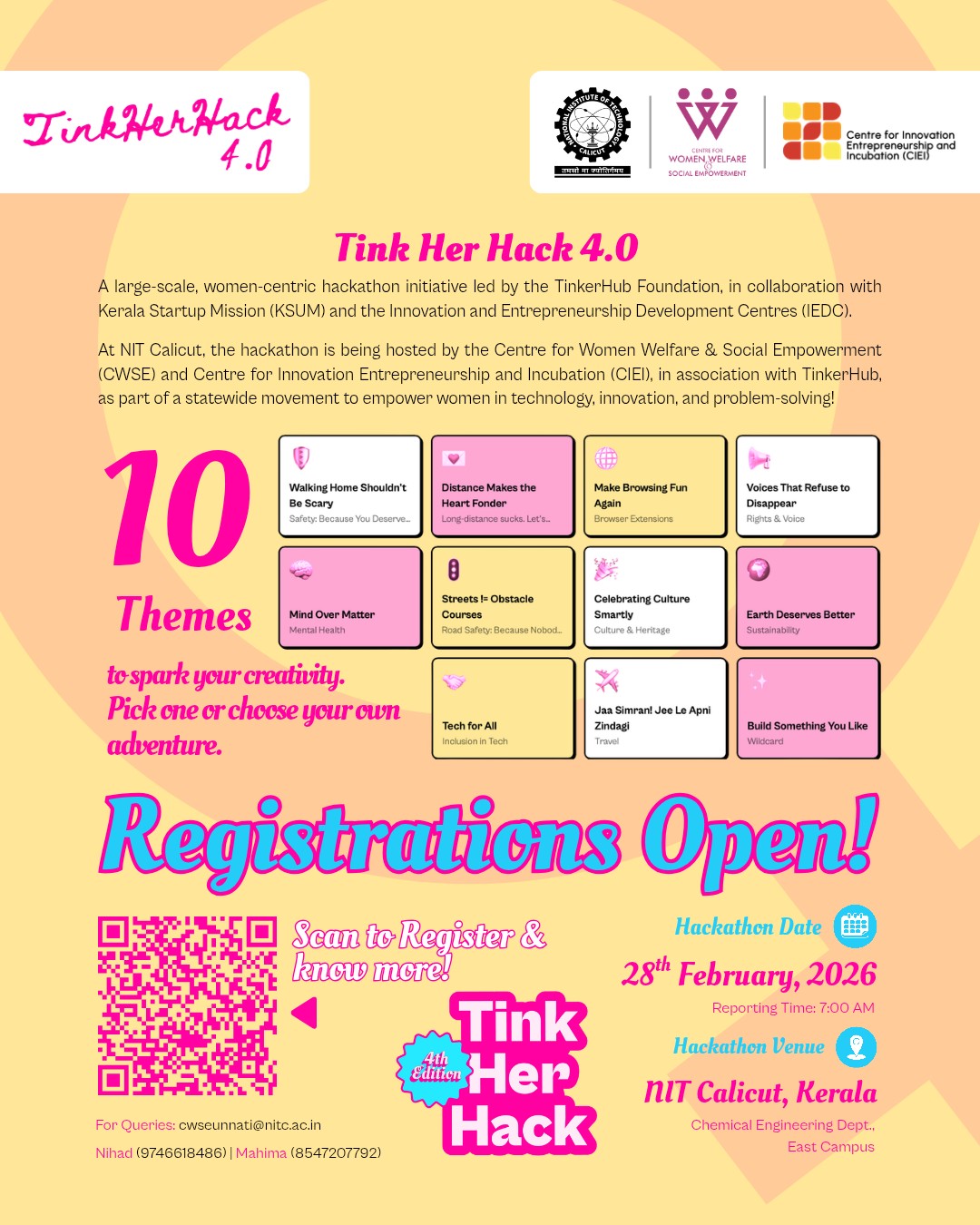 The Centre for Women Welfare and Social Empowerment (CWSE), in collaboration with IEDC NIT Calicut and Kerala Start-up Mission (KSUM), is organizing a Hackathon (Tink Her Hack 4.0) for girl students of our institute and nearby institutions on 28/02/2026 (7:00 AM to 7:00 PM) at National Institute of Technology Calicut. This one-day event aims to encourage young women to explore innovation, enhance their problem-solving abilities, and gain hands-on experience in technology and creative thinking. The hackathon will provide participants with opportunities to work on practical challenges and engage in collaborative problem-solving activities on women-centric themes. The event is open to UG, PG, and PhD female students. We invite our girl students to participate and showcase their technical competencies, critical thinking abilities, innovative ideas, and confidence in presenting their solutions. Interested girl students please complete the registration on or before 25/02/2026 (12 pm). (For more details, please refer to the attached poster). About the Tink Her Hack 4.0 Tink Her Hack has grown into one of Kerala’s most impactful student-led innovation programs. Across previous editions, the initiative has engaged 5000+ women students, enabled the creation of 2000+ student projects, and has been recognised as the world’s largest offline hackathon focused on women, based on participation and scale. The program has worked closely with ecosystem partners including KSUM, IEDC, IEEE Women in Engineering, and AnitaB.org, and its impact has been acknowledged by UN Women. As part of the hackathon outcomes, top projects from each hosting venue will be recognised and awarded. Further, students from the top project team at each venue will receive scholarship tickets to attend GHCI (Grace Hopper Celebration India), Asia’s largest conference for women in technology, made possible through Tink Her Hack’s partnership with AnitaB.org. This offers exceptional exposure for students to national and global technology ecosystems. To learn more about the initiative, please visit: https://her.tinkerhub.org