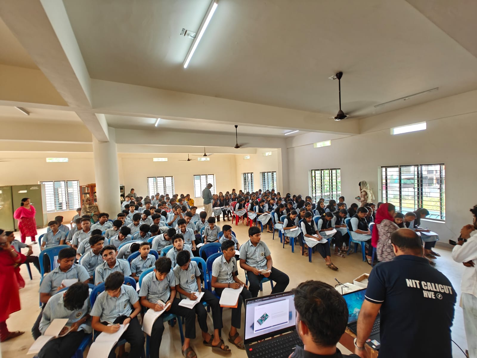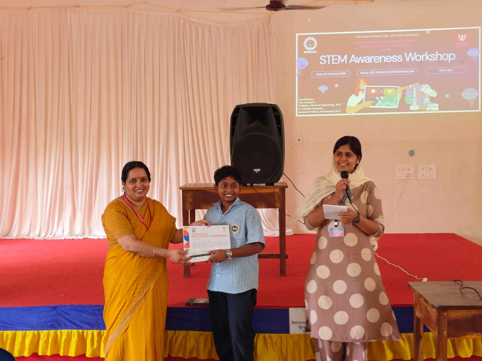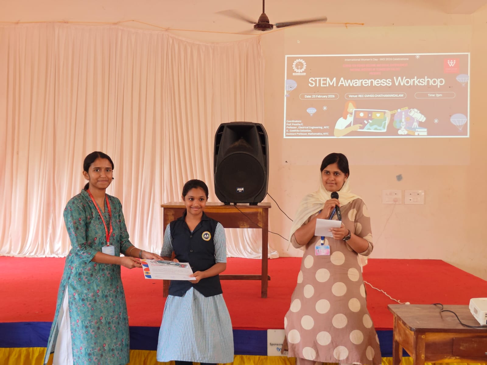 The STEM Awareness Program was organized by the Centre for Women Welfare and Social Empowerment (CWSE), National Institute of Technology Calicut, at VHSS NIT (REC) School on 25 February 2026 as part of the International Women’s Day (IWD 2026) celebrations. The programme was coordinated by Dr. Preetha, Professor, and Dr. Geethika, Assistant Professor, NIT Calicut, with the objective of motivating young students to develop interest and confidence in STEM (Science, Technology, Engineering, and Mathematics) disciplines. The event was conducted in the presence of the Headmistress, Ms. Sreekala, along with faculty members of the school. Students from Classes VIII and IX actively and enthusiastically participated in the programme. The session featured engaging lectures, live demonstrations conducted by Ph.D. scholars and B.Tech students, and interactive quiz activities designed to stimulate curiosity and foster interest in STEM fields. The demonstrations offered practical exposure to scientific concepts, making the learning experience both experiential and enjoyable. Prizes were awarded to students who actively participated and excelled in the quiz sessions, providing encouragement and motivation. The programme successfully inspired young learners to explore STEM domains and aimed to build confidence, curiosity, and awareness about opportunities in science and technology. The event concluded with positive feedback from both students and teachers of VHSS NIT (REC) School .